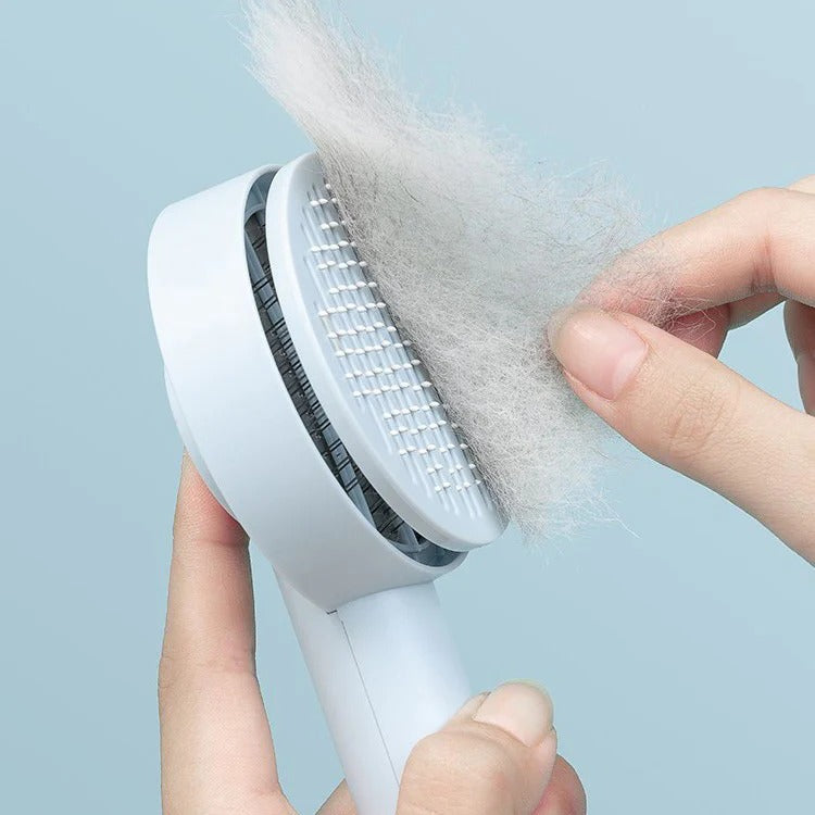 Once you're finished grooming your cat, press the button on the back of the brush to remove any loose fur from the bristles, done!
